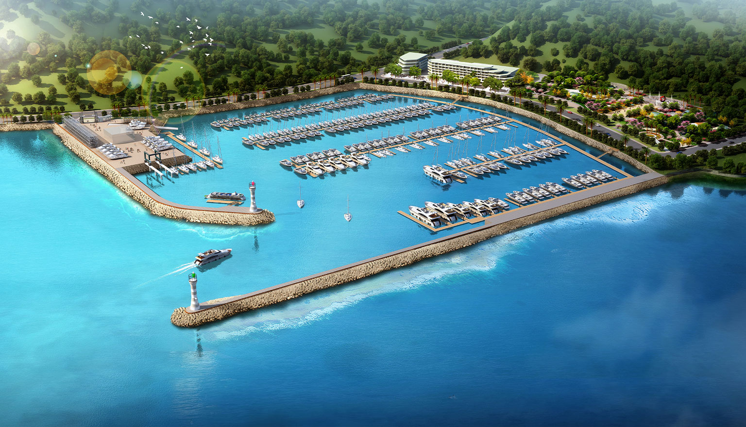 建設俱樂部大樓、約700米長的防波堤,8350平方米的游艇存放平臺,234個帆船及游艇泊位,124個干船艙,單線斜坡道和跨運車碼頭等設施。